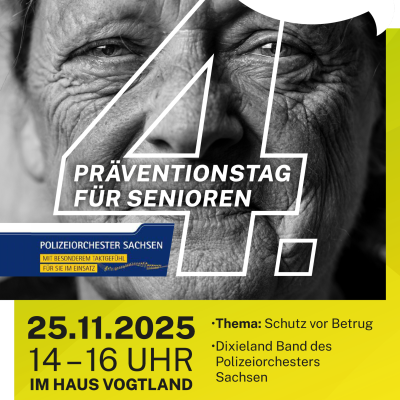 Seniorennachmittag am 25.11.2025 ab 14 Uhr im Haus Vogtland in Plauen (nähe Endhaltestelle Biller) mit dem Polizeiorchester Sachsen: Blasmusik, Tanz und Informationen zum Schutz vor Betrug.